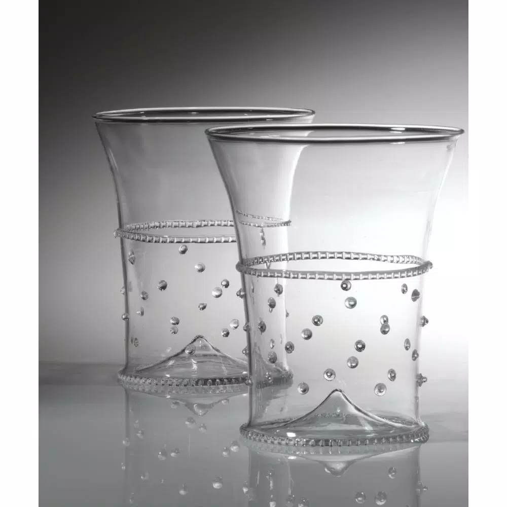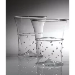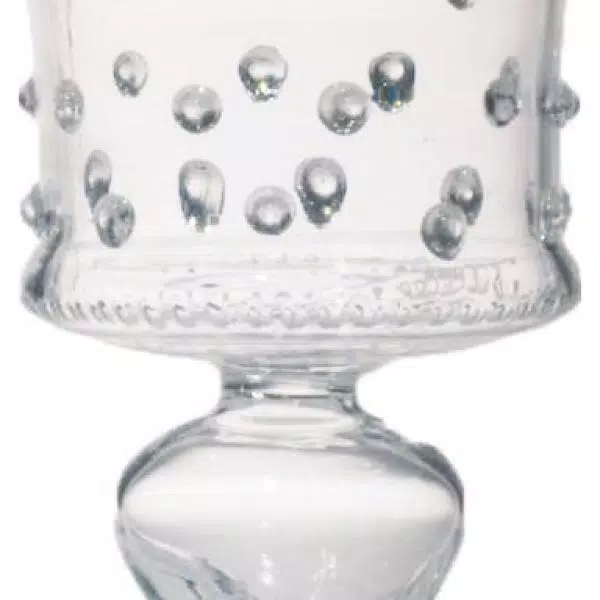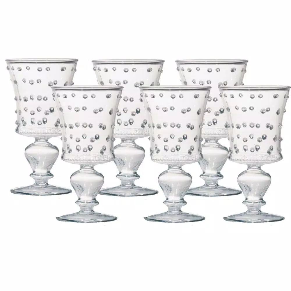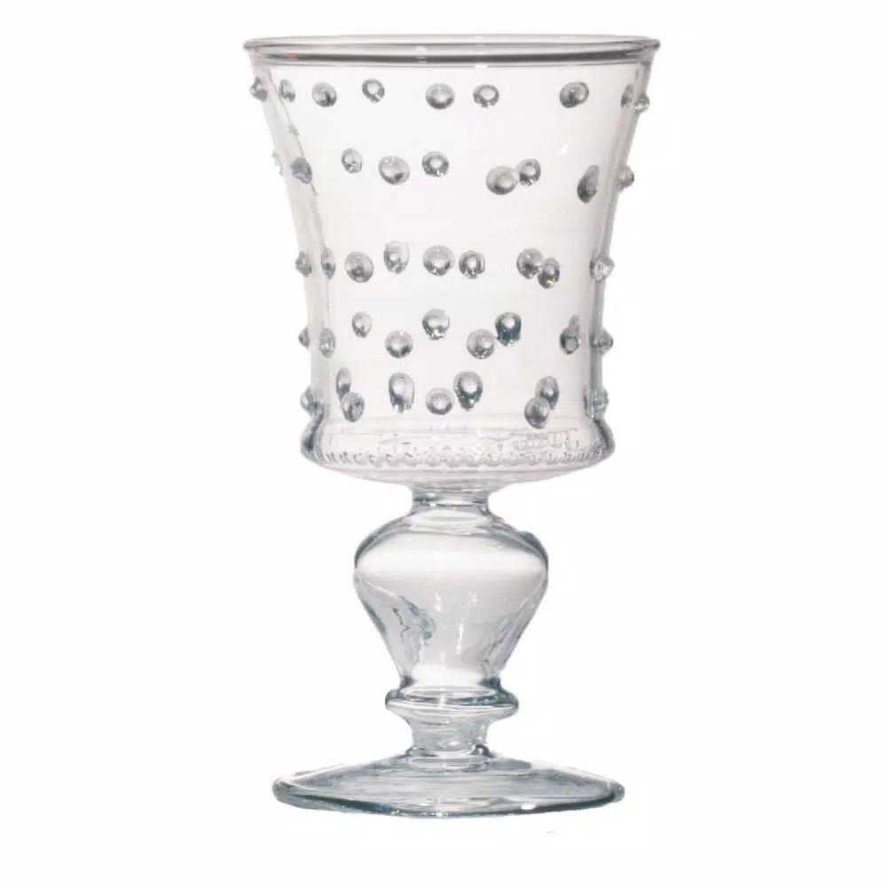 This is a charming small glass for liqueurs. It makes an attractive set on a cocktail tray. Each is handmade with many small applied glass dots as decor. There are 6 in the set.