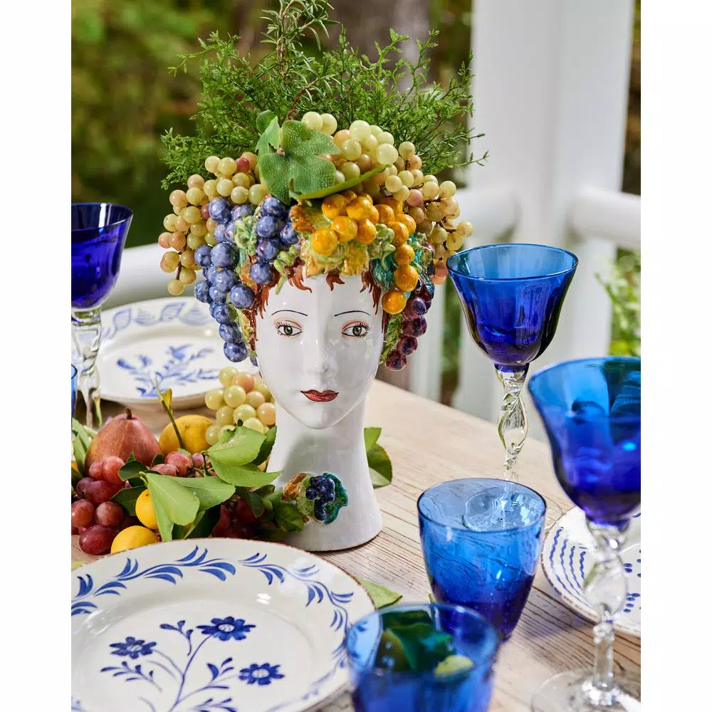 This beautifully executed blue double old fashioned glass has vertical lines of bubbles. The skills of the glass blower are on display. This all purpose glass comes in a set of 4.