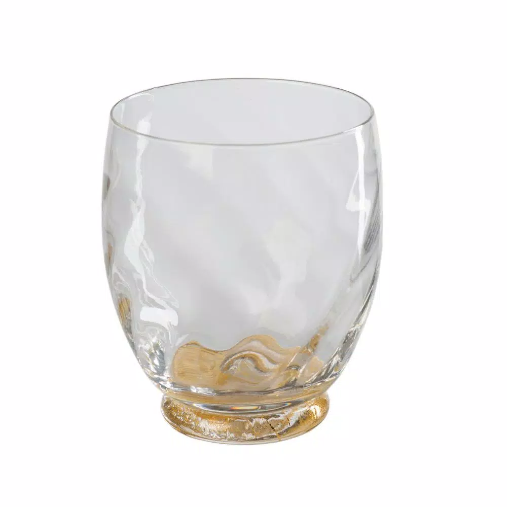 This is a beautiful Italian made stemless glass with gold infused into the base. It makes a very elegant setting on any table. It is sold as a set of 4.