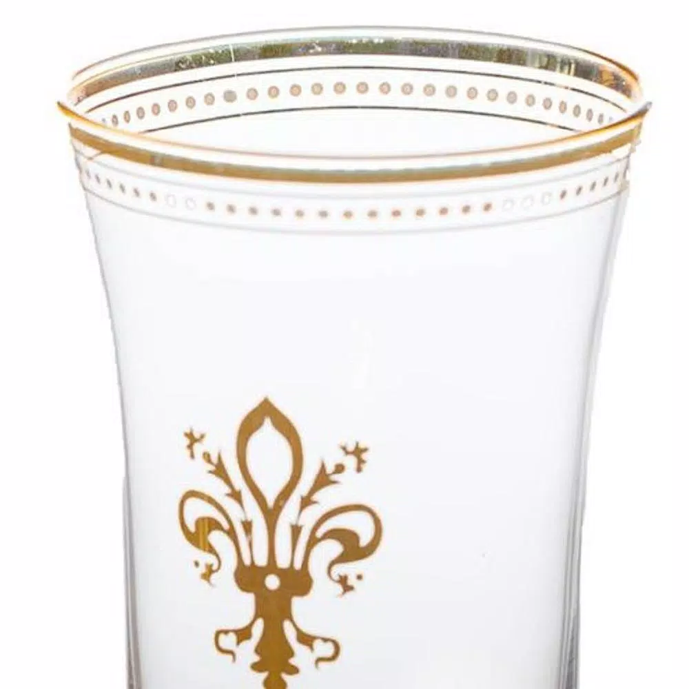 A crystal clear glass with a gold Fleur de Lis emblem. White dots with a gold band complete the decoration. Nice glass for all occasions and needs. Hand wash recommended. Set of 4.