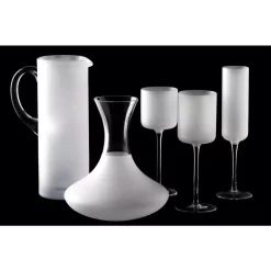 This is a sophisticated collection of table top glassware that includes a champagne, wine, and water glasses. A carafe and pitcher finish out this group of contemporary glassware of frosted and clear pieces. We recommend that you handwash the glasses.