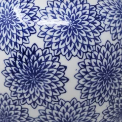 - Made up of ceramic and features a blue and white finish with golden accents on the lid
