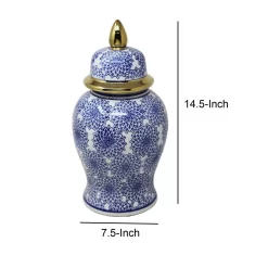 Bring home to stage your dining or drink area with this stylish ceramic temple jar. Beautifully designed, this jar with covered top lid is not only ready to hold all your condiments in the morning but will also coordinate with your kitchen interior. Made up of ceramic, this temple jar finishes a beautiful dahlia flower on the outer surface with a blue and white color. This also has a gold color rim and tip accent. This can be used to keep fresh coffee grounds near your coffee pot or espresso machine. You can also store sugar if you are in a mood to have a soothing cup of tea.
