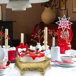 This hexagonal wedding cake stand with beautifully en-carved corners makes it more prominent and a great inclusion to your kitchen and dining spaces. It is made of aluminum and features a shinny gold finish, giving this cake stand an imperial look. The unique style of this cake stand, compliments cakes of different shapes and sizes. You can even use this stand for showcasing wedding cake, birthday cake or for any theme party.