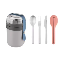 - Set includes: dual lunch pot and 4pc travel flatware set