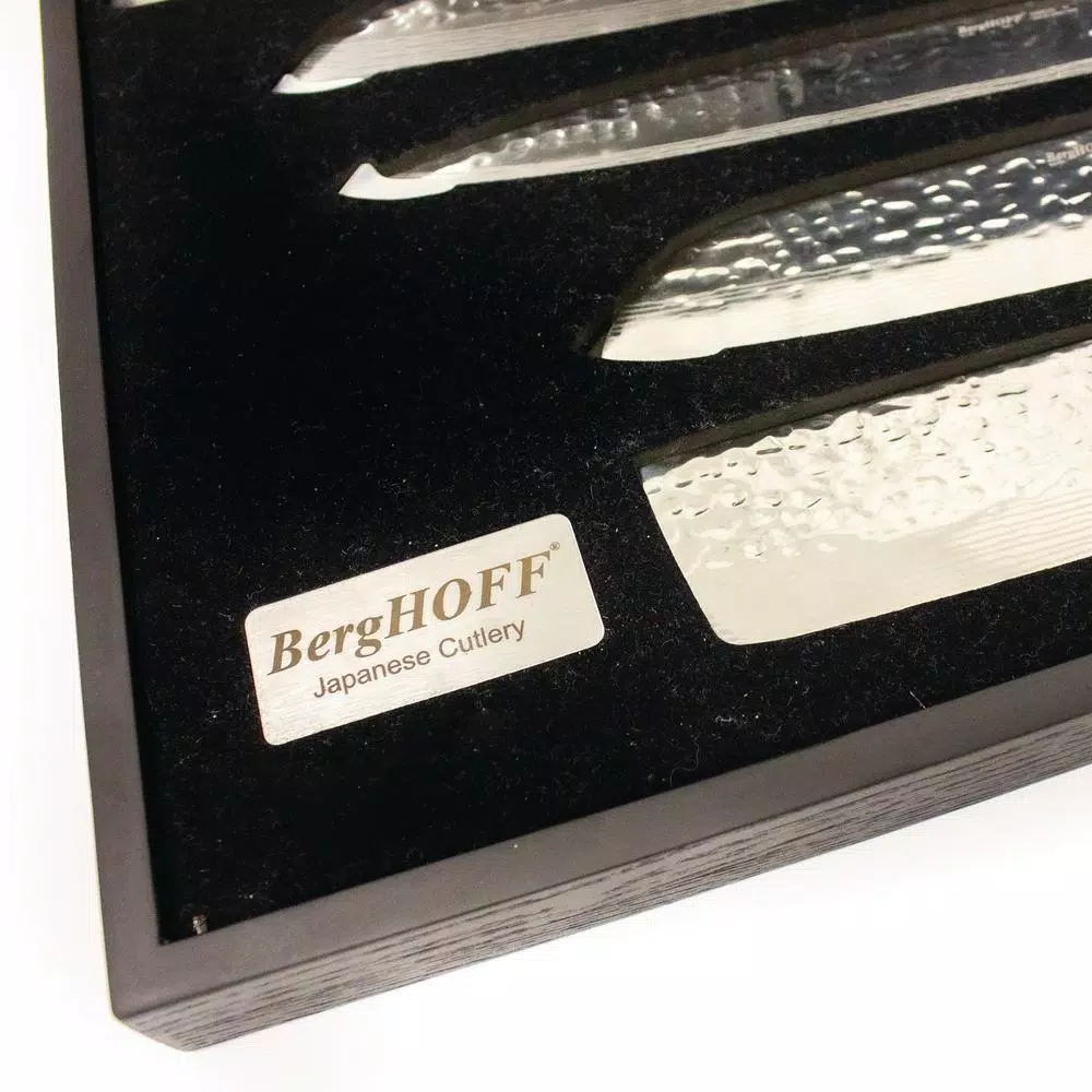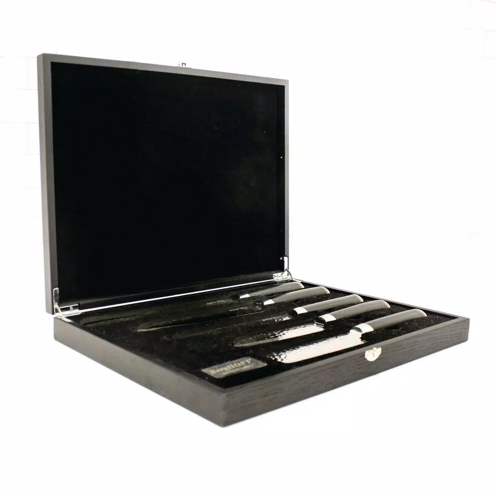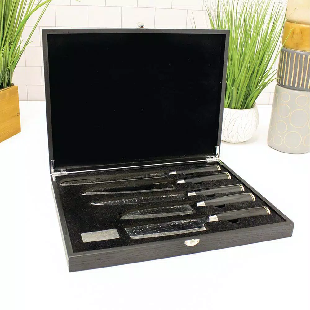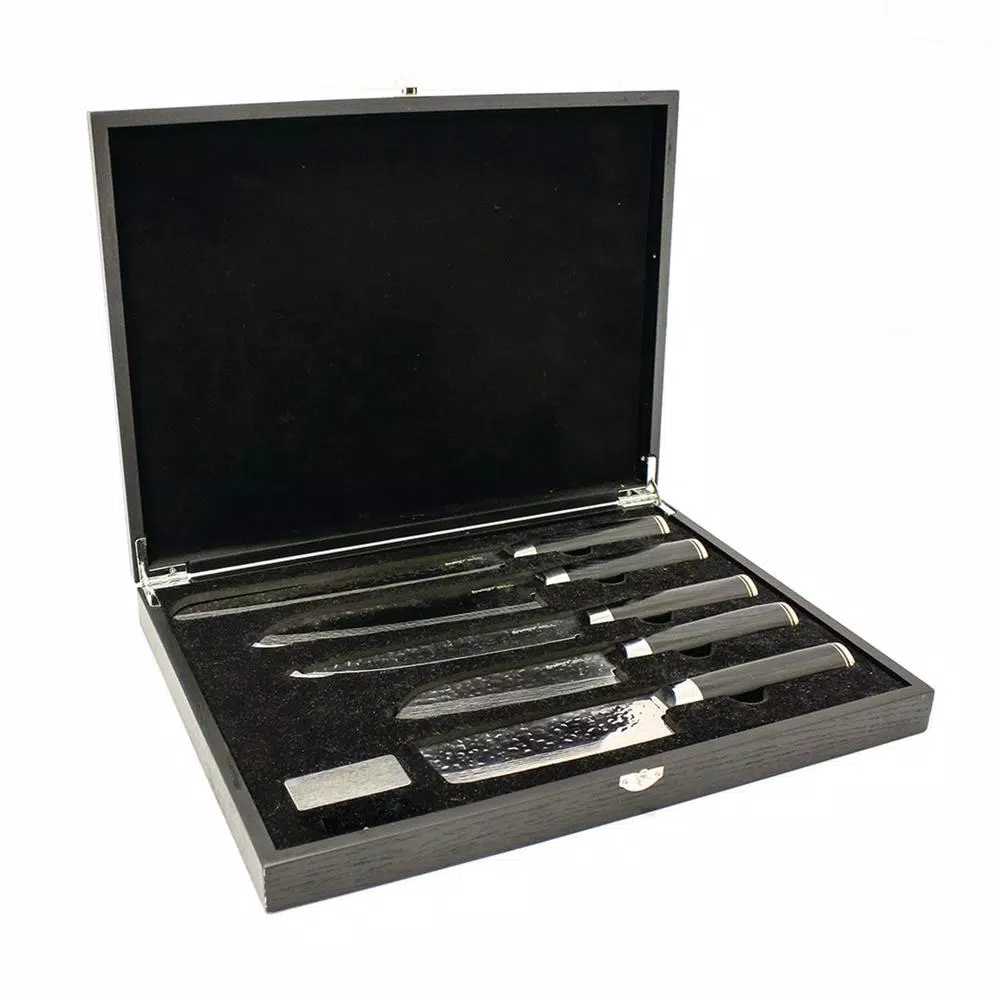 Make a bold statement with this gorgeous, textured-blade set of Martello knives. Crafted from German steel and sporting a sturdy, triple-riveted handle, these knives are designed to be both a beautiful addition to the modern kitchen and a long-lasting, reliable set of high-quality cutlery. Set includes: 7 in. carving knife; 7.5 in. chef’s knife; 9 in. bread knife; 5.5 in. Santoku knife; 5.5 in. cleaver
