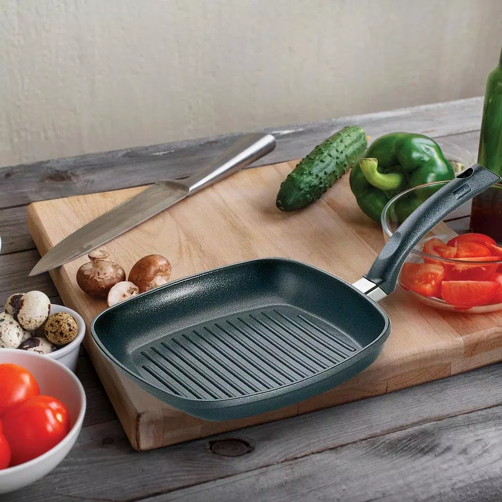 - 12.25 in. square grill pan featuring non-stick surface for low-fat cooking, hand wash