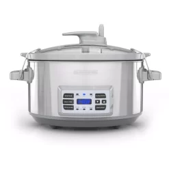 The BLACK+DECKER 7 qt. Digital Slow Cooker with Temperature Probe + Precision Sous-Vide gives you three ways to cook. 1.) Classic slow cooking is simple in the 7 qt. stoneware crock. Just add in the ingredients and let the low, constant heat go to work on roasts, soups, chilis, and so much more. 2.) Use the temperature probe to achieve ideal results on a variety of proteins. Just set the desired temperature, insert the probe into the meat, and the slow cooker will do the rest. 3.) For restaurant-quality results without the hassle or guesswork, use the Sous-Vide Function. Just arrange single servings of food inside the resealable bags, set the time and temperature based on what you’re cooking and the level of doneness you prefer, and then insert the temperature probe into the water. The sous-vide method helps prevent overcooking by heating the water that surrounds the food, bringing it to the desired internal temperature. When slow cooking, three heat settings give you options to find the best temperature for your schedule-Low for 8-9 hours of cooking, High for 3-4 hours, and Warm for keeping food at the ideal serving temperature. Plus, cleanup is easy thanks to the dishwasher-safe stoneware pot and tempered glass lid.