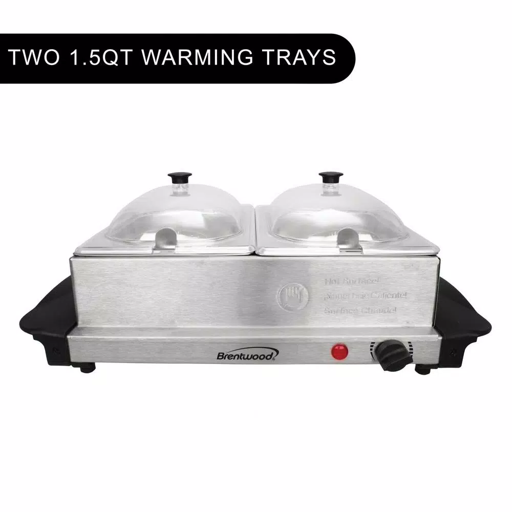 The Brentwood Appliances 3 Qt. 2-Pan Buffet Server and Warming Tray complements any kitchen or dining room setting. The buffet server and warming tray includes 2 heat-resistant, BPA-free, clear domed lids. Made from durable brushed stainless steel, the 2-pan server features adjustable heat control, cool-touch handles, and a power indicator light.