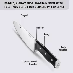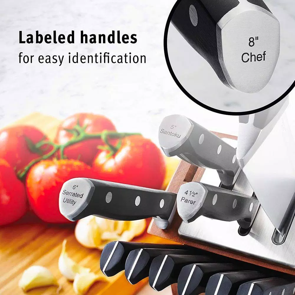 - Labeled handles for easy identification in the block; triple-riveted handles are contoured for a secure grip