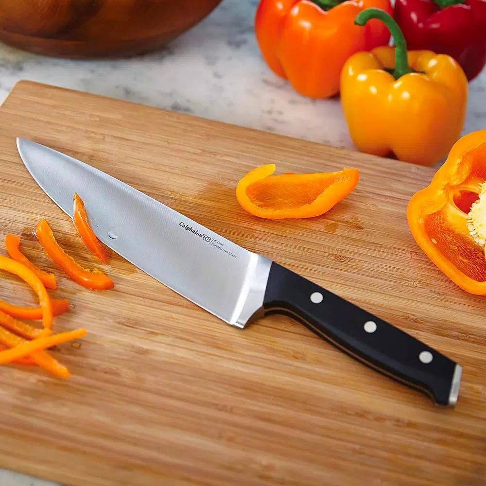 Knives stay sharp for a lifetime with Calphalon Classic Self-Sharpening Cutlery featuring SharpIN Technology. Sharpeners are built right into the block, automatically sharpening straight edge knives every time you remove them from the block to ensure peak sharpness at the start of every cutting task. Knives are made from high-carbon, no-stain forged steel and feature full tang construction and a comfortably balanced, triple-riveted handle. In addition, knife handles are labeled so you can always pull the correct knife out of the block. The Calphalon Classic Self-Sharpening 12-Piece Cutlery Knife Set includes an expanded selection of essential chef knives for dicing, chopping and more, plus 6-steak knives for family meals and more.