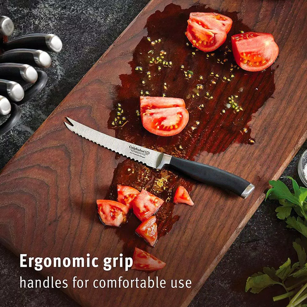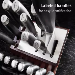 The Calphalon Contemporary Self-Sharpening 20-Piece Cutlery Set with SharpIN Technology features a block with built-in sharpeners that automatically sharpen straight edge knives with every use. Knives are crafted from premium materials with a fully forged blade, bolster and tang, and use high-carbon, no-stain German steel for life-long durability. Contoured handles are comfortably balanced and labeled on the end so you can pull the correct knife out of the block every time.