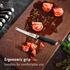 - Set includes: 4.5 in. paring knife, 5 in. boning knife, 5 in. santoku, 5.5 in. tomato/bagel knife, 6 in. fork, 6 in. utility knife, 7 in. santoku, 8 in. slicer, 8 in. chef’s knife, 8 in. bread knife, kitchen shears, 8-steak knives, sharpening knife block
