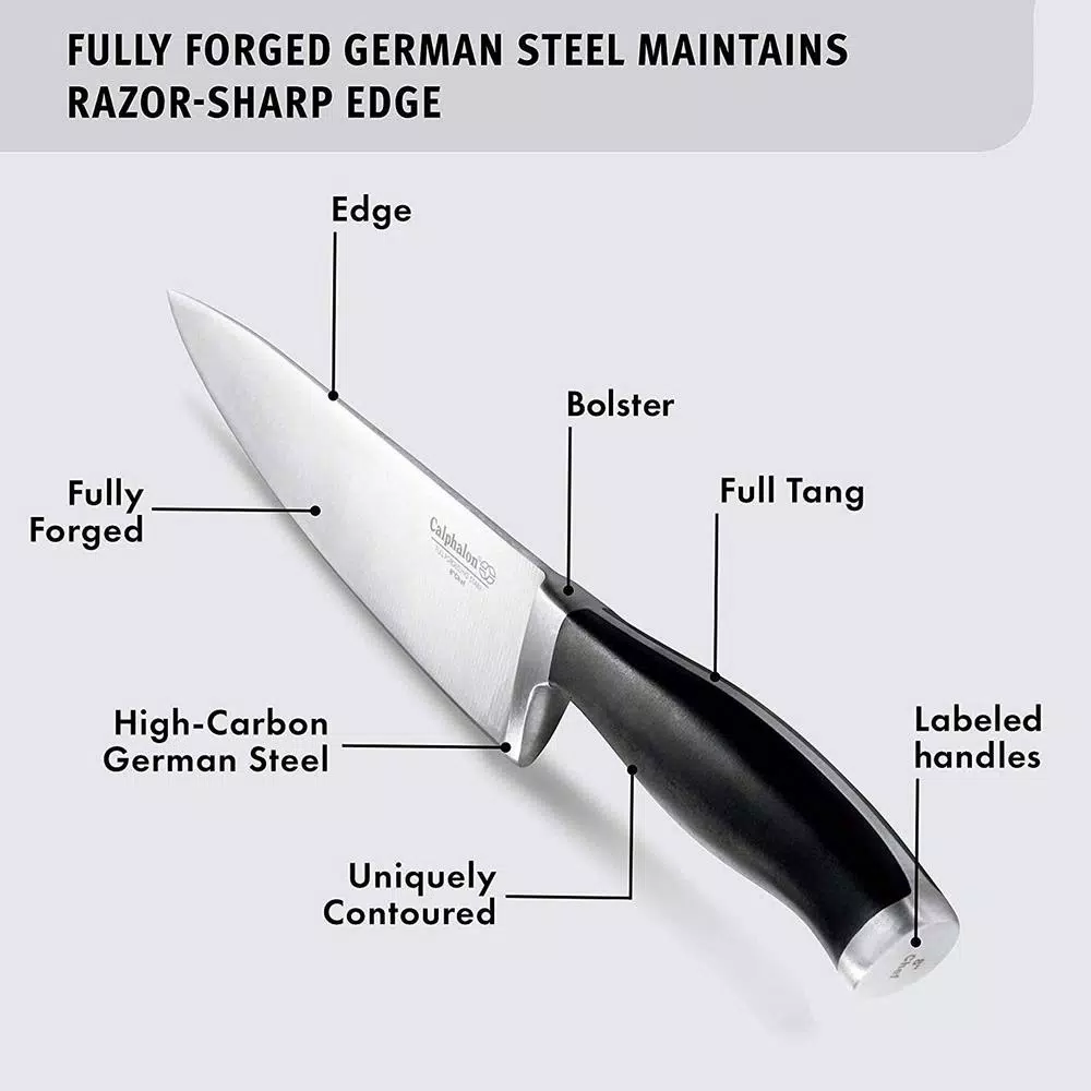 - Fully forged, high-carbon, no-stain German steel (steak knives made from stamped Asian steel)