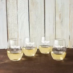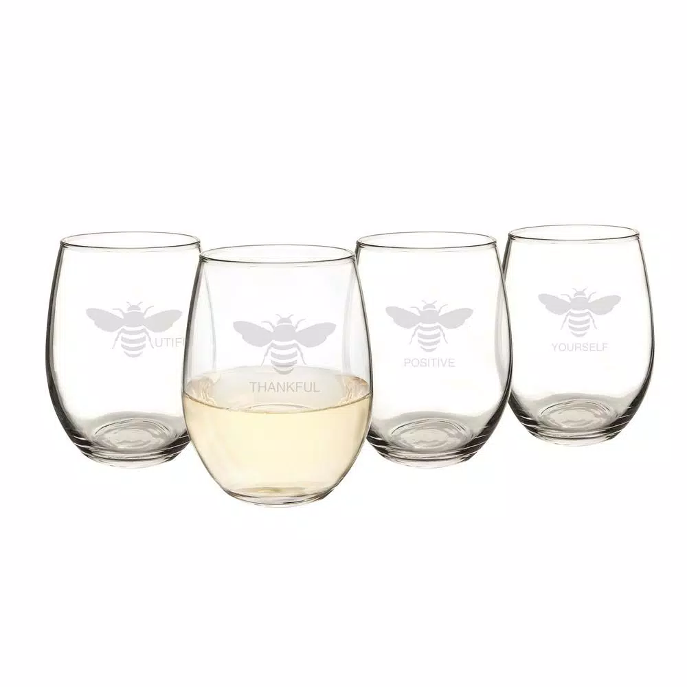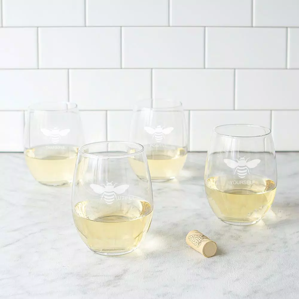 The Bee Thankful Stemless Wine Glasses are perfect for everyday dining and special occasions. Engraved with a cheerful “bee” design and phrase, each glass is beautifully crafted with a flat bottom and modern belle. This wine set would be a great gift for any wine/bee enthusiast or an excellent addition to your own glassware collection.