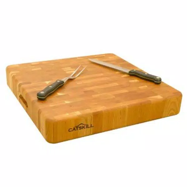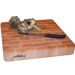 This Catskill Craftsmen The Slab End Grain Block is made of Northeastern hardwood, which provides durability and an attractive element to your kitchen. The board features finger slots on the sides for easy transport around your kitchen, and the 18 in. x 18 in. size allows ample space to cut meats and produce.