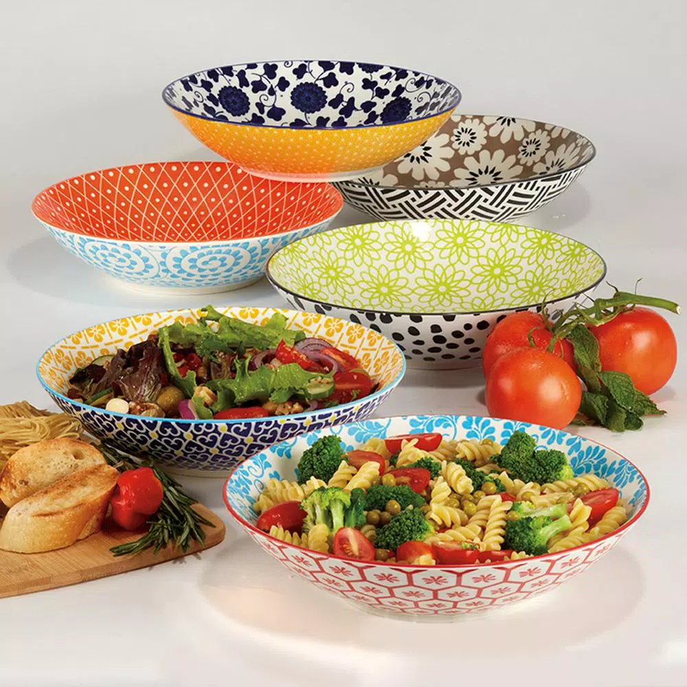 The Chelsea Set of 6 dinner bowls with colorful mix-n-match floral and geometric patterns is a fun addition to any table. Dinner bowls are the new dinner plates and these porcelain bowls are perfect for serving meals in a bowl, as well as salads, soups, pasta and desserts. Generously sized at 9β diameter by 2.25 βdeep, dishwasher and microwave safe for easy care.