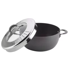Circulon Radiance is engineered with superior nonstick technology and time- and energy-saving dishwasher-safe convenience. The heavy-gauge hard-anodized cookware construction of this casserole provides balanced heating for every cooking technique, from a stovetop sausage lasagna to crispy braised chicken thighs with carmelized onions and bacon. The sturdy handles provide comfortable, confident handholds, and are dual-riveted for added support, and a shatter-resistant glass lid allows cooking to be monitored while sealing in heat and moisture. Plus, the casserole includes a convenient locking and straining colander so steaming asparagus and shrimp or boiling up the perfect tortellini is as easy as cook, strain, and drain. Plus, the casserole’s cooking surfaces boast the TOTAL Nonstick System of raised circles and PFOA-free, metal utensil safe nonstick for natural food release and easy cleanup that lasts 10 times longer than normal nonsticks. Best of all, Radiance cookware is dishwasher safe for the ultimate in convenient cleanup. Oven safe to 400F and compatible with all stovetops except induction, Circulon Radiance cookware includes a Hassle-Free Lifetime Guarantee. Move forward to the next level of one-pot meals and kitchen convenience with the dishwasher-safe Circulon Radiance Hard-Anodized Nonstick 5.5qt Covered Casserole.