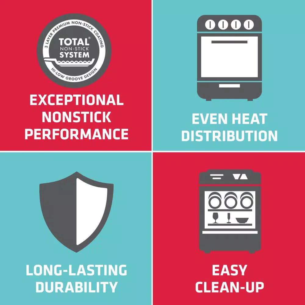 - Boasts the total non-stick system of raised circles and PFOA-free, metal utensil safe non-stick for natural food release and easy cleanup that lasts 10 times longer than normal non-sticks