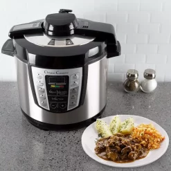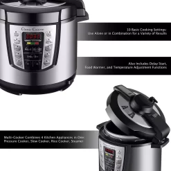 The Classic Cuisine Multi-Cooker helps you cook meals faster while sealing in the juices and flavors. We also include a free Oven Mitt, Measuring Cup and Mixing Spoon. This cooker comes with 10-basic cooking settings, Soup/Stock, Fish/Veg/Seafood, Chicken, Braising, Stew/Chili, Slow Cook, Rice, Multi-Grain, Steam, Potatoes, a Built in Start Delay Timer, a Warmer setting and the ability to adjust time and temperature as you desire.