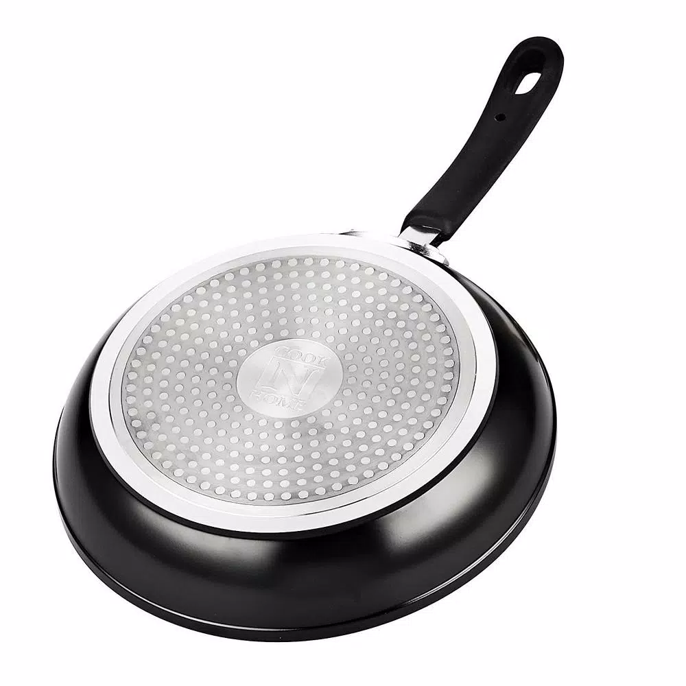 The Cook N Home 8 in., 10 in., and 12 in. 3-Piece Non-Stick Fry Pan Set in Black is made of thick gauge aluminum that provides even heat conduction and prevents hot spots. Nonstick coating makes cleaning easy and is cadmium and lead free. Bottom is compatible with induction stoves. Soft handles are comfortable and stay cool while cooking. Dishwasher safe, oven safe to 350F, and can be used on all types of stovetops. Please do not use metal utensils as it may scratch the nonstick coating. Over-heating may damage nonstick coating. Putting a hot pan in cold water may reduce nonstick coating life span. See further details in use and care manual.