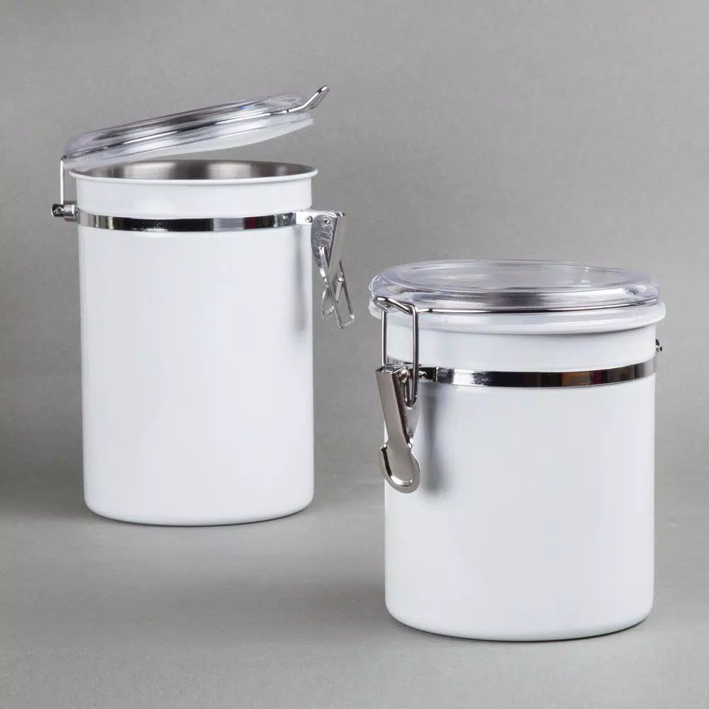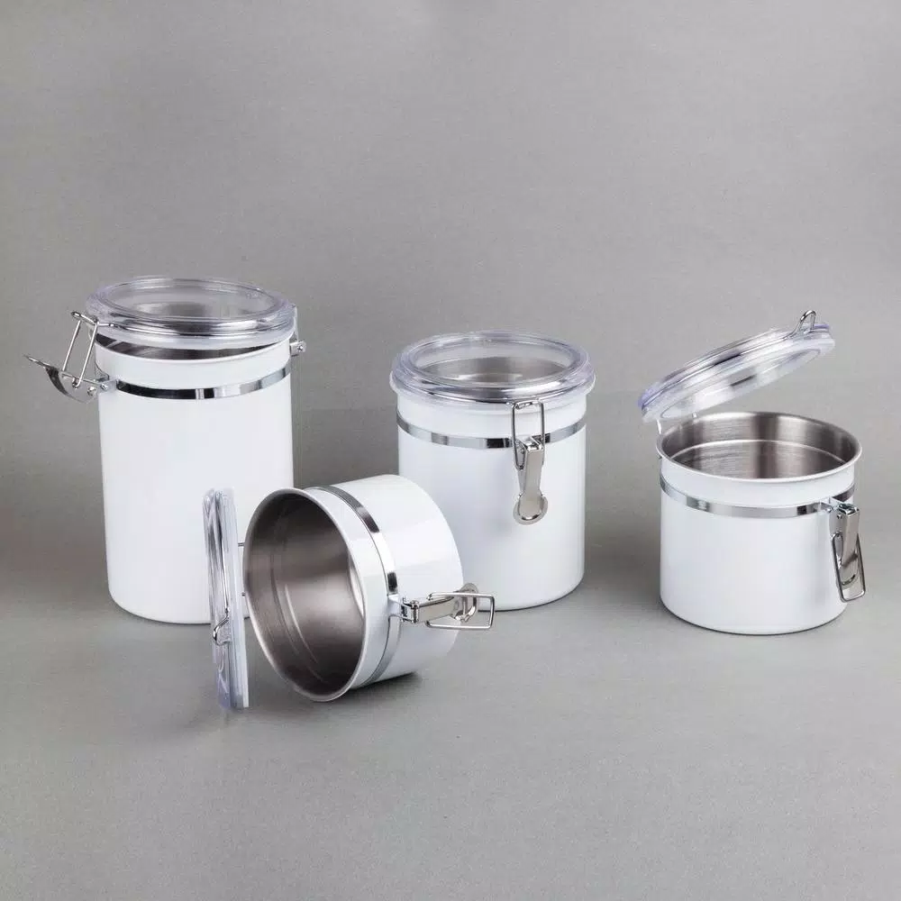This 4-Piece stainless steel canister set, food storage container with air tight lid and locking clamp, White color finish is made of rust-resistant stainless steel and beautiful white powder coating, this canister set will decorate any kitchen perfectly and durably. See through acrylic lid with silicone gaskets and locking clamp to help preserve and stored food items. Great for storing coffee beans, tea, sugar, flour, cookies and milk powder. This canister set contains 4-different capacity size, include 1- each of 26 oz., 36 oz., 47 oz. and 62 oz. Wipe canister with a damp cloth, easy cleaning.