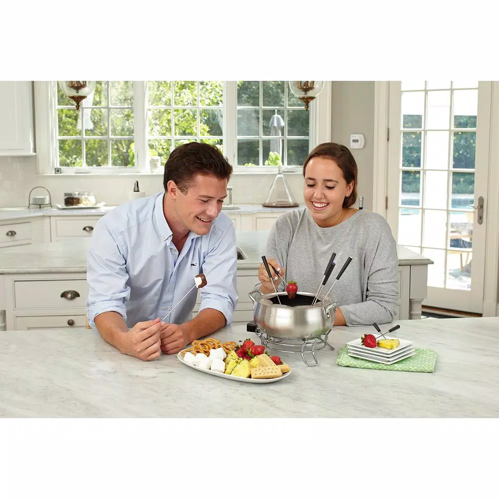 Cuisinart Electric Fondue Set Now fondue is easier than ever. The stick-free Cuisinart Electric Fondue Set has a heating element built into the base of the pot and a thermostat that adjusts to a wide range of temperature settings. Consumers can prepare chocolate, cheese, broth or oil fundues in this elegant 3 Qt. brushed stainless pot. As always, Cuisinart makes cleanup easy. The nonstick pot offers superb food release, and the entire unit is dishwasher safe.