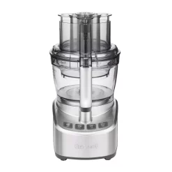 Cuisinart Elemental 13-Cup Food Processor features a 550-Watt peak power motor with 13-cup large work bowl and 4-cup smaller, inner nested work bowl. Its Seal Tight Advantage System seals bowl and locks blade with stainless steel body for added durability. It includes a dicing disc with 10 mm grid plus cleaning tool, stainless steel reversible shredding disc and stainless-steel adjustable slicing disc. Furthermore, it also features electronic touchpad controls that display High, Low, Off and Pulse with illuminating blue LED lights.