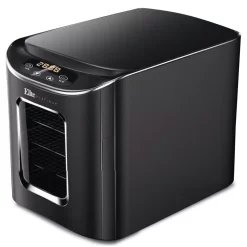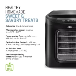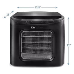 6 stainless steel mesh dehydrating trays for dehydrating foods at a fraction of the cost of commercially dehydrated foods with no additives or preservatives Each drying tray measures 10.5″ x 11.5″ Dry a variety of foods: fruits, vegetables, meats and more as healthy snacks. Trays, fruit roll sheet, drip pan are fully immersible and dishwasher safe Lightweight, counter-top design Horizontal air flow. No tray rotation needed. Ultra-quiet fan Digital control panel with LED display Adjustable timer from 30-min to 24-hrs Adjustable thermostat from 95°F to 160°F 480 Watts