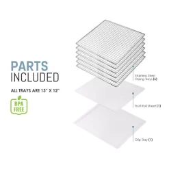 - Stainless steel trays, fruit roll-up sheet/drip pan are fully immersible and dishwasher safe