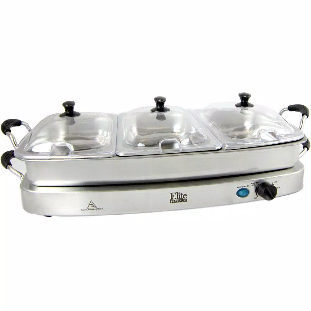 Keep the party going with the Deluxe Buffet Server by Elite. A total of three 2.5 Qt. buffet trays and a flat warming tray warm hors d’ oeuvres and other foods like fluffy mashed potatoes and rich, saucy gravy. Adjustable temperature settings give you full control. Great for parties and entertaining guests. As an added bonus, this unit also includes one large, oven safe 7.5 Qt. stainless steel pan with silicone handles for keeping roasted chicken or larger cuts of meat warm and tender.