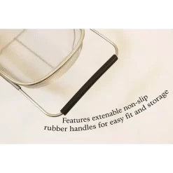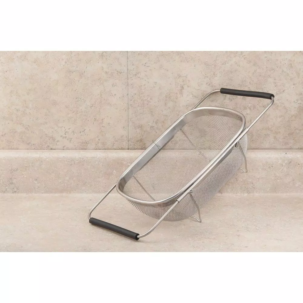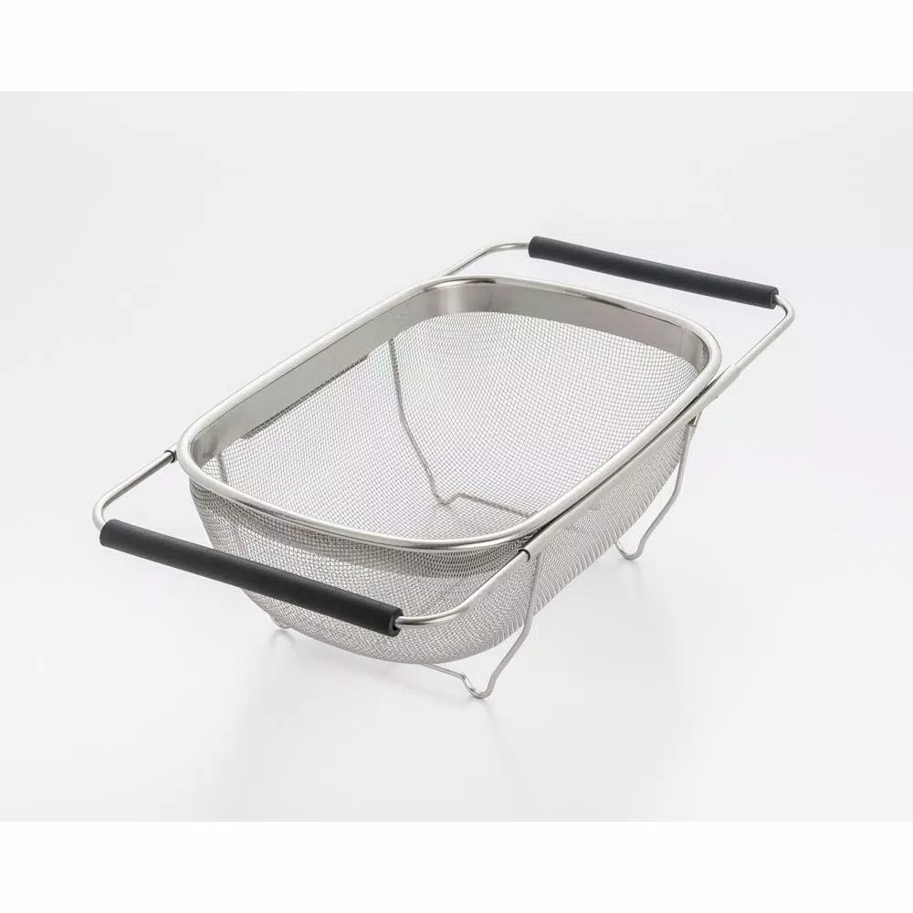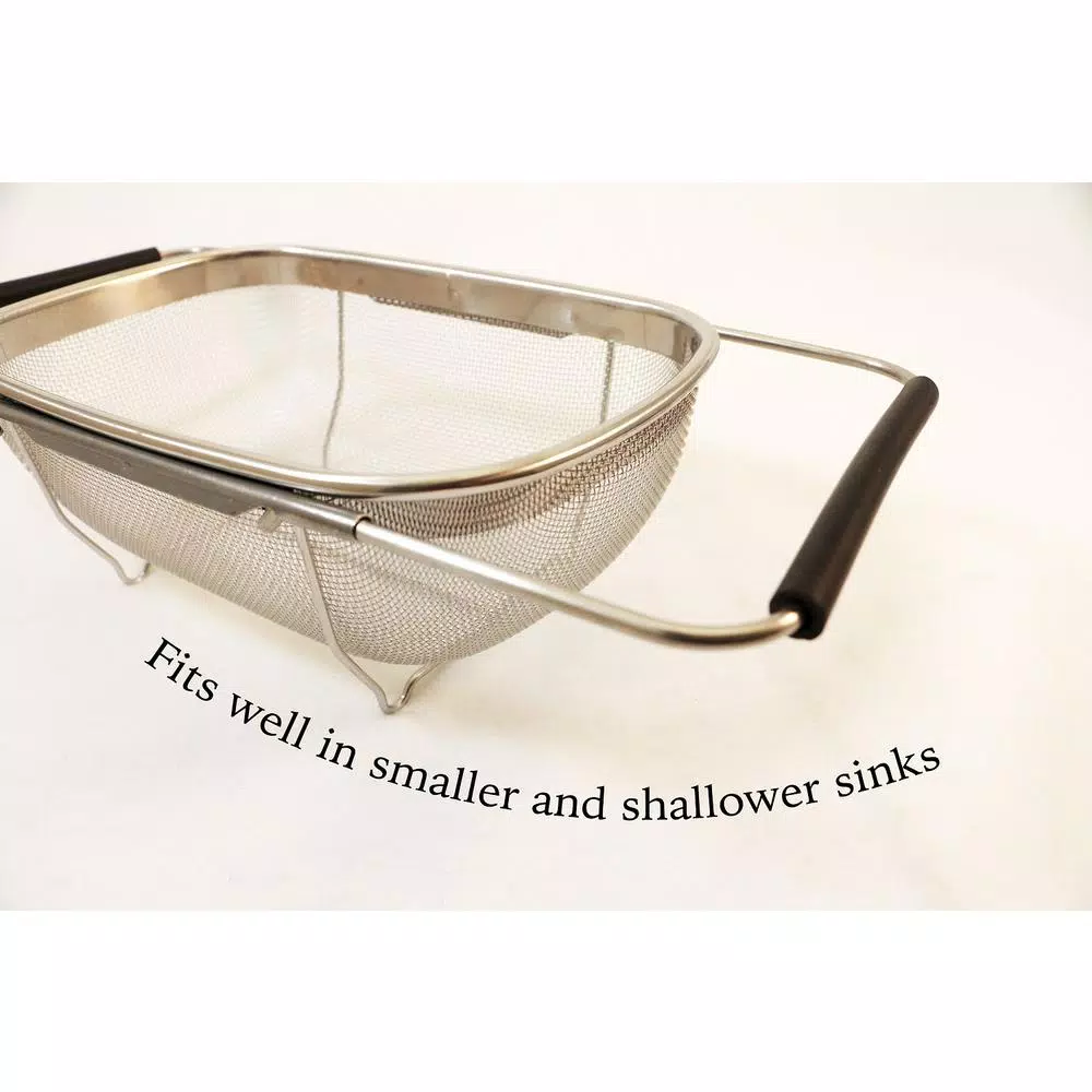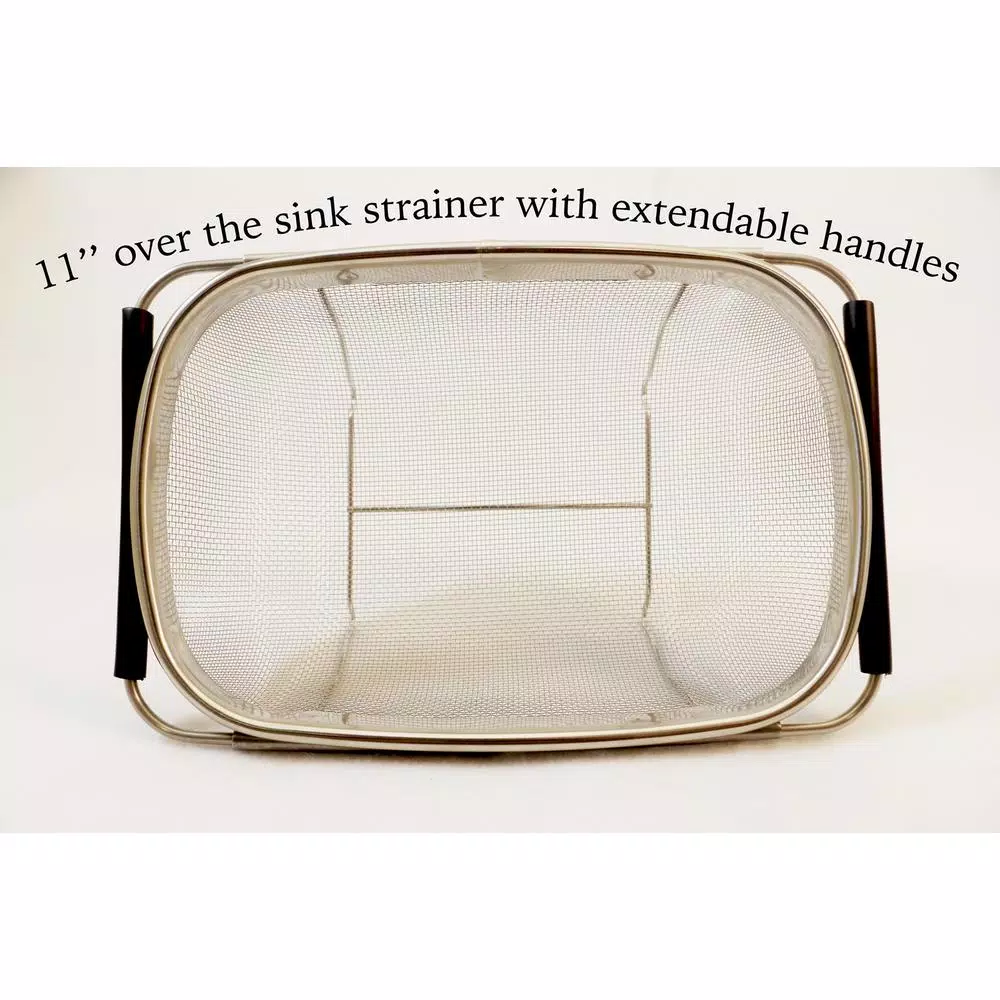 This 11 in. over the sink stainless steel mesh strainer is perfect for everyday use. Fits well in smaller and shallower sinks and has extendable non-slip rubber handles to be placed over longer sinks as well. Perfect for rinsing fruits and vegetables and straining pasta.