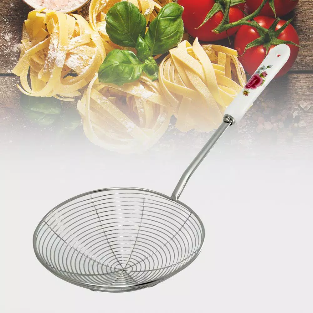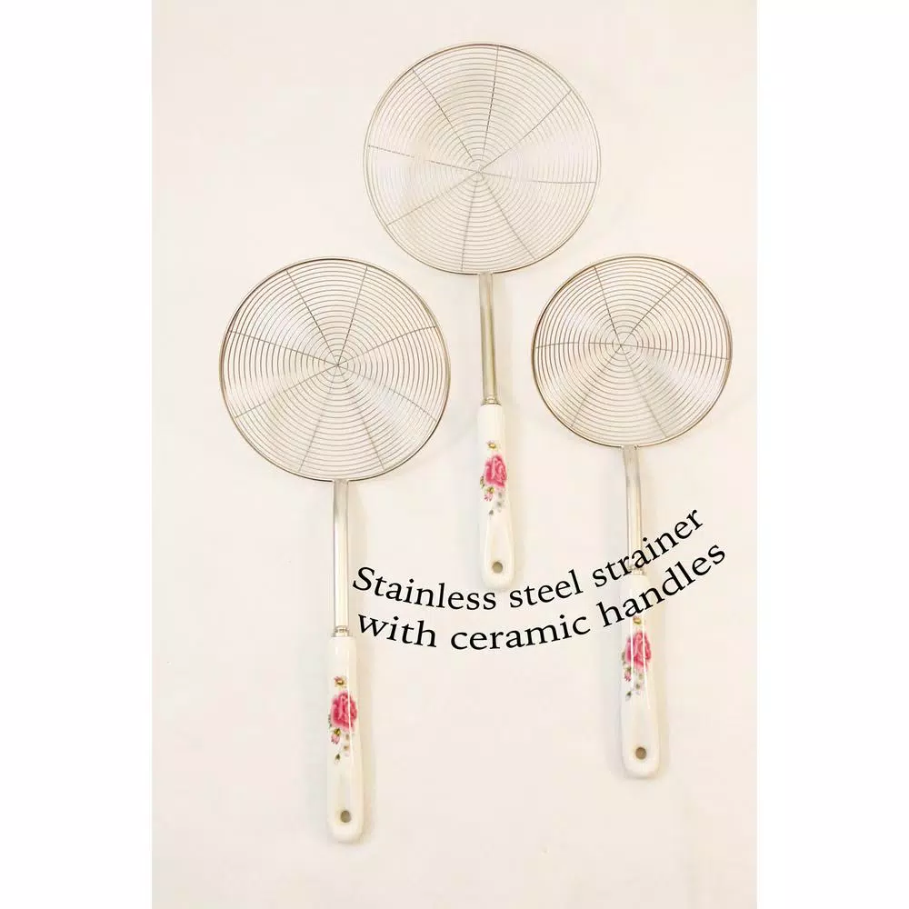 This stainless steel strainer features a long handle to keep your hands away from the heat. The handle is encased in a ceramic flower pattern design with an end hook for convenient hanging and storage. The strainer is made of high quality stainless steel to ensure long-lasting durability and reliability.