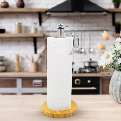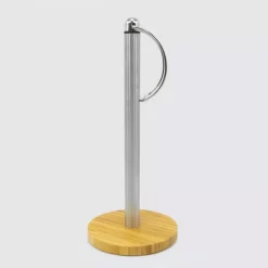 - Features a side rod to secure paper towels from unraveling and a beautiful bamboo base