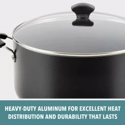 Farberware Cookware always combines stylish construction with great cooking results, and the Farberware Aluminum Nonstick 10.5 Qt. Covered Stockpot is no exception. Aluminum construction helps this Farberware stockpot heat quickly and evenly from base to rim, and the long-lasting nonstick interior provides beautiful food release for seared sirloin cubes, browned chicken, and all the other delicious ingredients in homemade soups and stocks. The capacity is generous enough for a large batch of the family’s favorite stew or soup for a local picnic or potluck. A shatter-resistant glass lid helps hold the heat and moisture inside the covered pot and keeps the cooking visible for reducing broths and other liquids. Farberware cookware has been making cooking shine in home kitchens for years, and this durable stockpot is constructed for years of use. The easy-to-clean exterior brings a dash of style to any kitchen, and because the stockpot is dishwasher safe, cleanup is as simple as can be. The double-riveted side handles are solid for plenty of support and leverage when moving or pouring from the filled pot. Conveniently oven safe to 350°F, this stockpot makes a perfect addition for whenever your own Farberware set can use an extra boost or a fresh piece. Every kitchen needs a sizeable stockpot for stews, soups and more, and the recipe truly begins with the Farberware Aluminum Nonstick 10.5-Quart Stockpot.