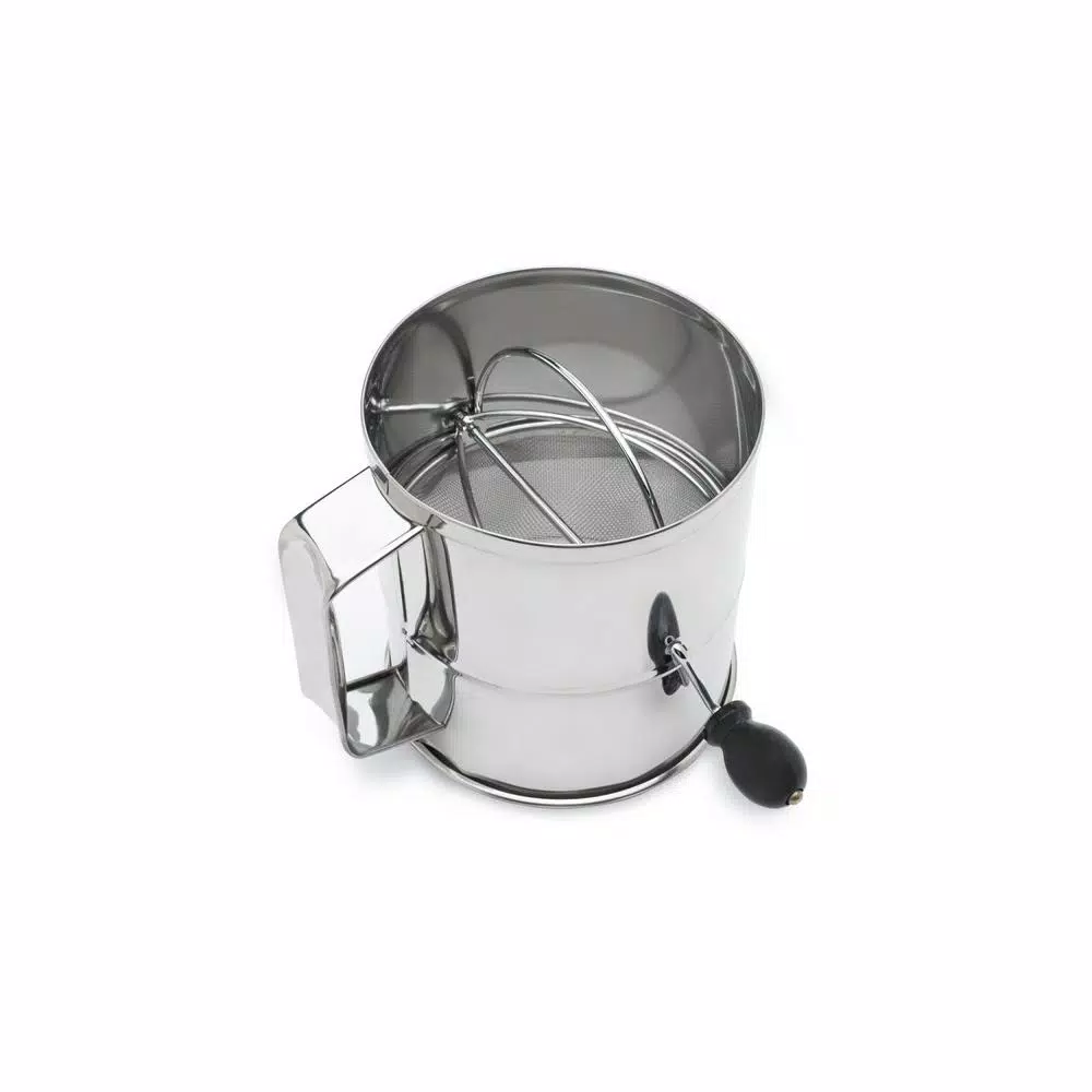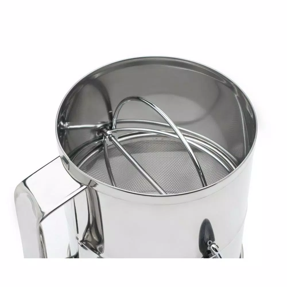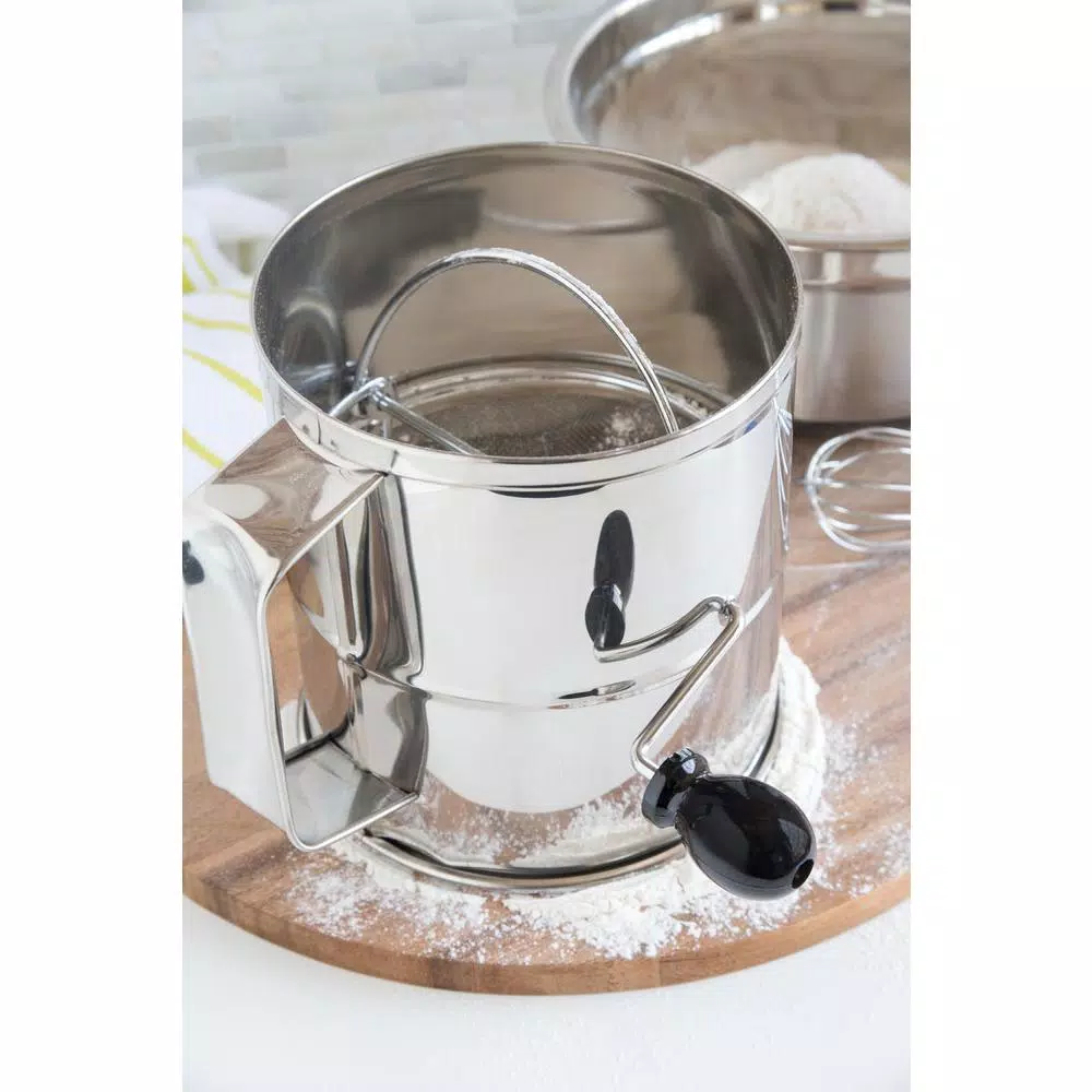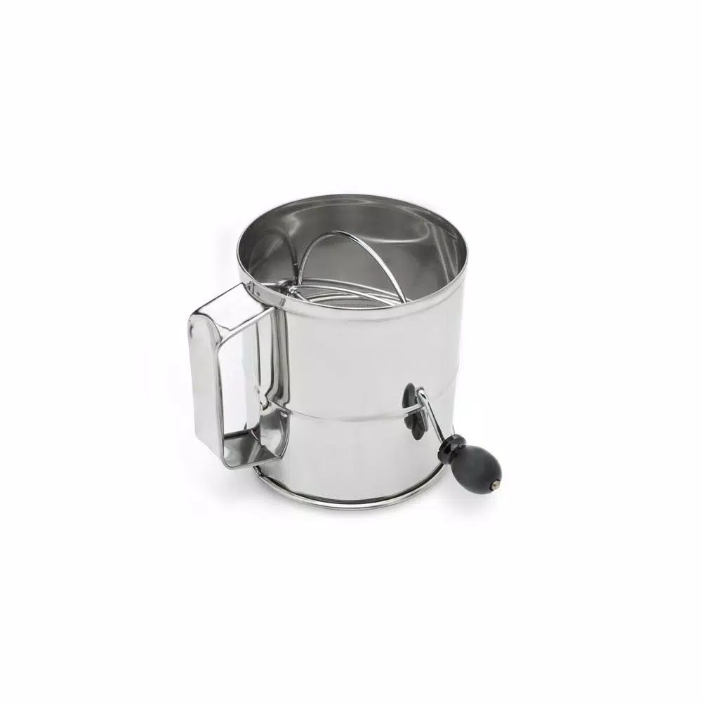 Make mixing flour into other ingredients easier by sifting with this 8-Cup Flour Sifter. This classically styled, crank-handled sifter has been a favorite of bakers for decades. It quickly breaks up any lumps in the flour and aerates it at the same time to give you lighter, more consistent, clump-free results. Made of durable stainless steel with a fine mesh screen, this sifter is the perfect size to sift larger amounts. Easy to use: simply turn the crank handle to deploy the sifter inside. A must-have for making genoise, angel food cake, or sponge.