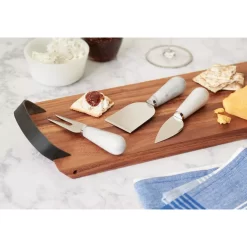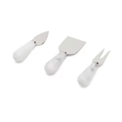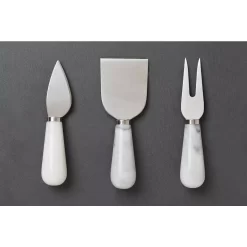 Elegant white marble and stainless steel cheese knife set featuring unique teardrop-shaped handles for comfortable grip (see above images). Cheese knife, slicer and spreaders enables you to easily handle and slice all types of cheese–hard and soft–parmesan, swiss, brie, ball, asiago, cheddar, feta, parmigiano, monterey jack, gouda, goat, and more. Sure to be a hit at your next wine and cheese party. Great compliment to cheese boards, wire slicers, fondue and serving sets, and other gourmet gadgets. Makes a great gift – order now!