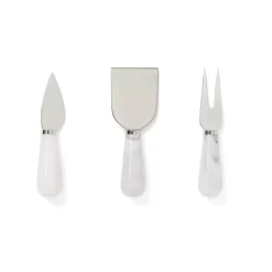 Elegant white marble and stainless steel cheese knife set featuring unique teardrop-shaped handles for comfortable grip (see above images). Cheese knife, slicer and spreaders enables you to easily handle and slice all types of cheese–hard and soft–parmesan, swiss, brie, ball, asiago, cheddar, feta, parmigiano, monterey jack, gouda, goat, and more. Sure to be a hit at your next wine and cheese party. Great compliment to cheese boards, wire slicers, fondue and serving sets, and other gourmet gadgets. Makes a great gift – order now!