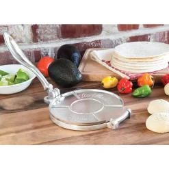 Love preparing your own authentic Mexican dishes? Complete with a tortilla dough recipe, this Tortilla Press enables you to easily make your own delicious tortillas right at home. Fabricated from sturdy cast aluminum, this press has a striking polished finish and is oven safe up to 350 degrees. Simply place balls of corn dough, or masa, into the center of the press and apply pressure using the lever. Now you have flat tortillas that are ready to bake. Also can be used to make arepas, tostones, empanadas or any other flat bread or treat! Small, light, and portable, this tortilla press will be a smash hit at your next fiesta, dinner party, pot luck, or family meal. Forget store-bought tortillas, and complete your favorite meals with the unbeatable taste of fresh, homemade corn tortillas.