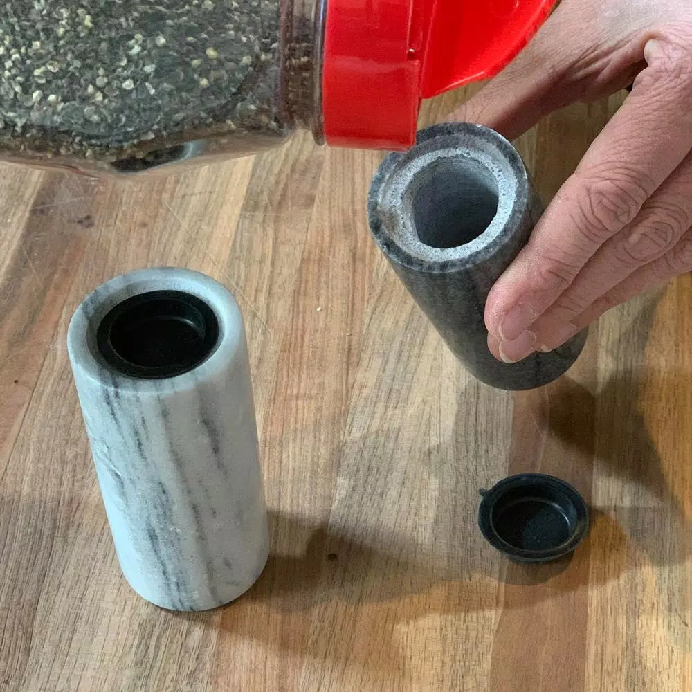 - High quality, classic salt and pepper shaker set includes a white marble shaker for salt and a black marble shaker for pepper