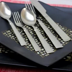 The Gibson Home Prato 65 piece flatware set provides everything you need for dining and serving. With its traditional square handle, it features an embossed design pattern for added flair. It is made of stain and rust resistant stainless steel for long-lasting satisfaction.