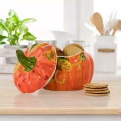 Bring fall vibes into your home with the Gibson Home Stoneware Pumpkin Cookie Jar in Orange with Lid. The pumpkin deign features a reactive glaze finish that sets a nice and cozy tone. It features a naturally artistic watercolor like texture. Store cookies, crackers, candy, or small handy tools like needles and thread.