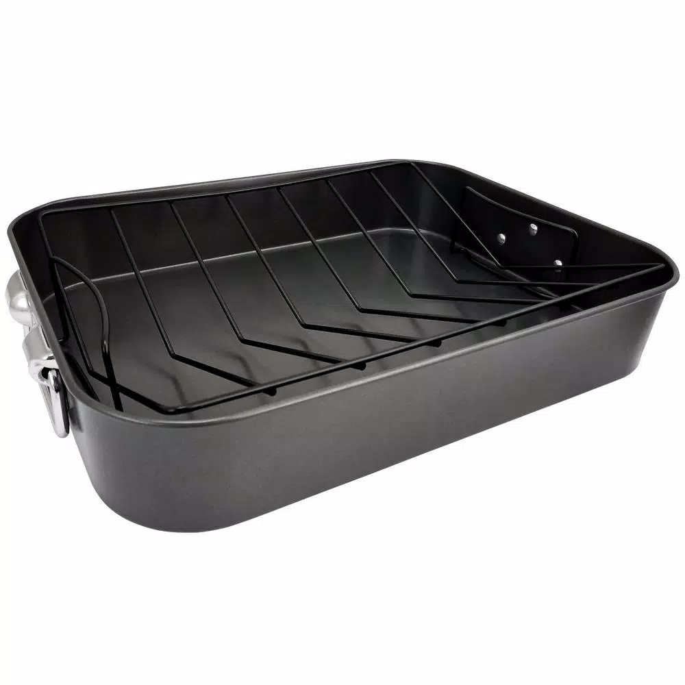 Gibson Home’s Top Roast Non-Stick Roaster includes a 16 in. x 12 in. x 3 in. Roaster and a metal rack. Silver Handles provide an easy grip and roaster is presented in a handsome silver color. Carbon steel construction is strong and durable. Non-stick interior is perfect for low-fat cooking and is easy to clean. Hand wash is recommended. A great value for an appealing and convenient roasting pan.