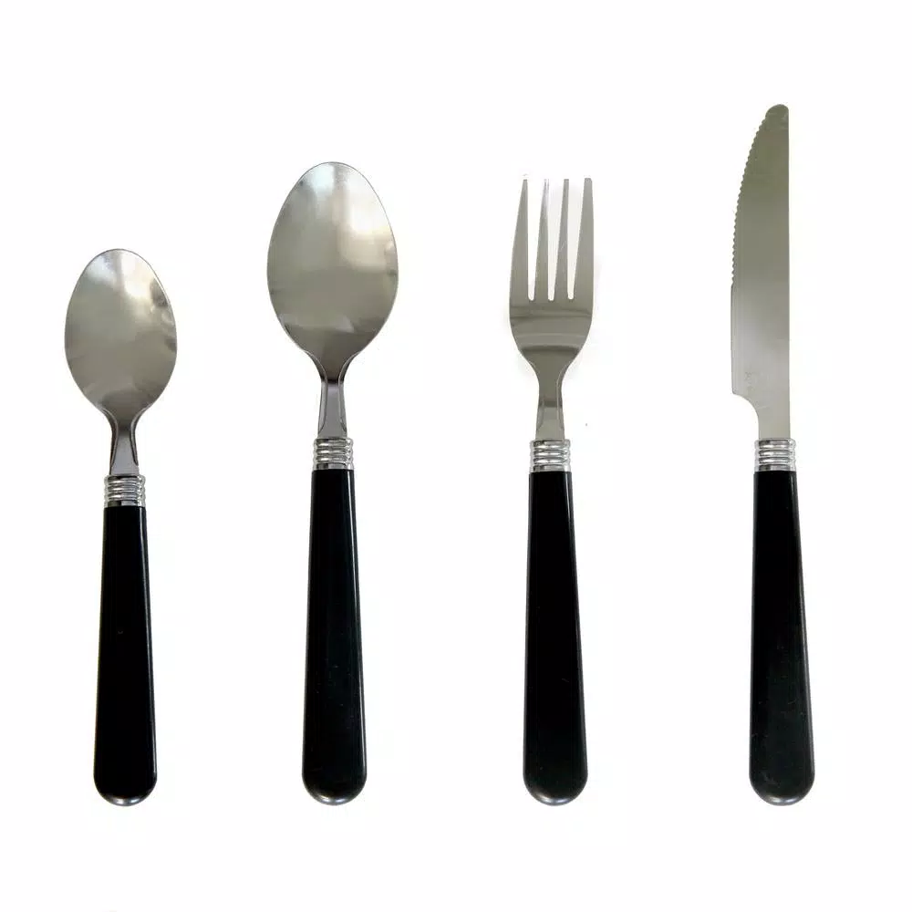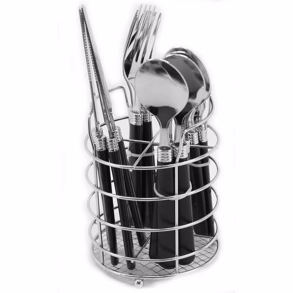 - Set includes 4-dinner forks, 4-dinner knives, 4-spoons, 4-teaspoons and one round metal wire caddy