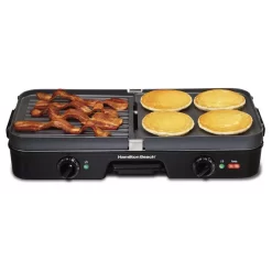 Hamilton Beach 3-in-One Grill/Griddle Grill, griddle or both – all at once. Enjoy the restaurant-quality results you want with the three-in-one cooking functionality you need. Amazingly adaptable, the 3-In-One Grill/Griddle works as an indoor grill, as a griddle or as a grill and griddle combo. The nonstick, reversible and removable cooking plates are easy to snap in and out of place, and together make up 180 square inches of cooking surface. Two cooking areas with individual, adjustable heat controls lets you prepare an entire meal at once. The center grease channel and tray removes extra fat and reduces mess. The cooking plates and grease tray are both dishwasher safe, making clean up a breeze.