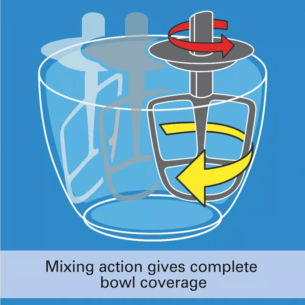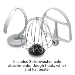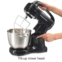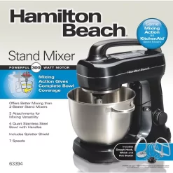 Built for a variety of batters and mixes, this Hamilton Beach Stand Mixer can do everything from whip delicate meringues to mix sticky bread dough. The powerful 300 watt motor can handle the thickest of ingredients, including those peanut butter chocolate chip cookies your family devours. And the best part is, you never have to scrape the bowl or hand-mix at the end – the planetary mixing action rotates the beaters around the entire bowl, for even and complete mixing. Seven speeds lets you go from a slow stir to a fast mix, with exact control at each one. Plus, a helpful guide at the mixer’s top lets you know which speed to use for various mixing methods. Nonslip feet keep the mixer still while in use, and the splatter shield guards against messy drips, drops and spills. Attachments include a flat beater, dough hook and whisk. All attachments, as well as the stainless steel 4-quart mixing bowl, are dishwasher safe for fast cleanup.