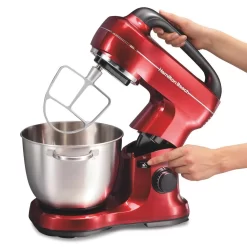 This Hamilton Beach Stand Mixer can do everything from whip delicate meringues to mix sticky bread dough. The powerful 300-Watt motor can handle the thickest of ingredients, including those peanut butter chocolate chip cookies your family devours. And the best part is, you never have to scrape the bowl or hand-mix at the end the planetary mixing action rotates the beaters around the entire bowl, for even and complete mixing. 7 speeds lets you go from a slow stir to a fast mix, with exact control at each 1. Plus, a helpful guide at the mixers top lets you know which speed to use for various mixing methods. Nonslip feet keep the mixer still while in use and the splatter shield guards against messy drips, drops and spills. Attachments include a flat beater, dough hook and whisk. All attachments, as well as the stainless steel 4 qt. mixing bowl, are dishwasher safe for fast cleanup.