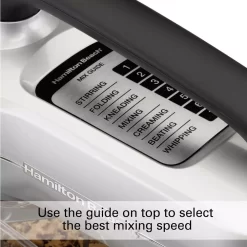 Hamilton Beach Stand Mixer Hands-free mixing with complete bowl coverage Built for a variety of batters and mixes, this Hamilton Beach Stand Mixer can do everything from whip delicate meringues to mix sticky bread dough. The powerful 300 watt motor can handle the thickest of ingredients, including those peanut butter chocolate chip cookies your family devours. And the best part is, you never have to scrape the bowl or hand-mix at the end – the planetary mixing action rotates the beaters around the entire bowl, for even and complete mixing. Seven speeds lets you go from a slow stir to a fast mix, with exact control at each one. Plus, a helpful guide at the mixer’s top lets you know which speed to use for various mixing methods. Nonslip feet keep the mixer still while in use, and the splatter shield guards against messy drips, drops and spills. Attachments include a flat beater, dough hook and whisk. All attachments, as well as the stainless steel 4-quart mixing bowl, are dishwasher safe for fast cleanup.