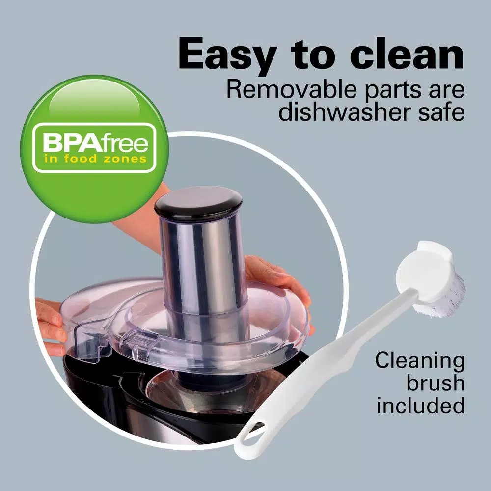 Whats your favorite juice? Whether its orange, apple or carrot, enjoying a fresh glass has never been easier. With its large chute and powerful motor, the Hamilton Beach Big Mouth Plus 2 Speed Juice Extractor makes quick work of fruits and vegetables with little prep time required. And with a 40 ounce juice container, there is no need to stop every few seconds to empty the container. Just juice and pour. When youre done, cleanup is a snap. All the parts are dishwasher safe and a cleaning brush is included for use in the strainer basket. The Hamilton Beach Big Mouth Plus 2 Speed Juice Extractor is easy to assemble and store, but why put it away? With attractive stainless steel accents and a compact design, it may become a favorite countertop accessory.