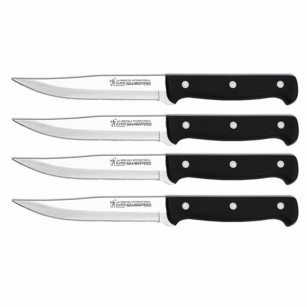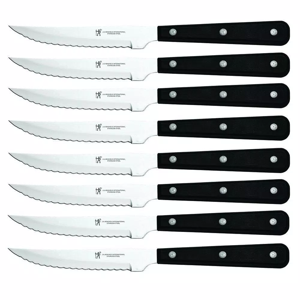 J.A. Henckels International Serrated Steak Knives feature large serrations, each with smaller serrations ensuring exceptional sharpness and longevity. Classic triple rivet styling fits any kitchen. Set of eight.
